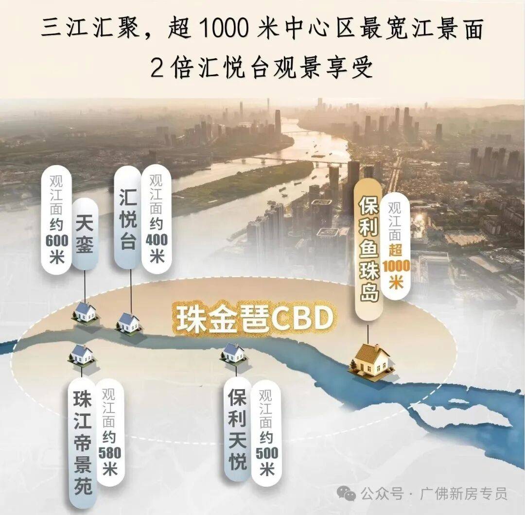 珠金琶史诗级同框,一眼望尽三十年(全画幅、长纵深的天际线江景)第一次买江景房的人,有江就行。实正的江景藏家,选的是江景的面宽和纵深和背后的故事感。对比广州江景豪宅,汇悦台不雅江面约 400 米、保利天悦约 600 米,而保利鱼珠岛江景面超 800 米(最宽 1000 米),宽度约为汇悦台的 2 倍,远超同类顶豪。